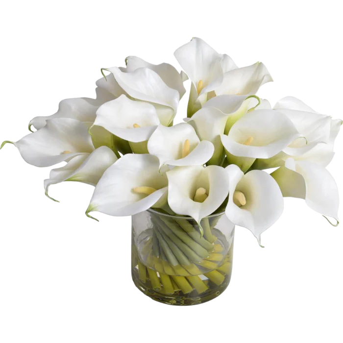 Two dozen stems of faux white Calla lilies with large lifelike flowers are cut and arranged by hand into a clear glass vase. Permanently secured with clear acrylic “water” in a tapered clear glass vase for a “fresh from the florist” appearance.