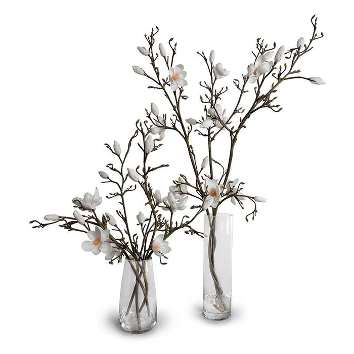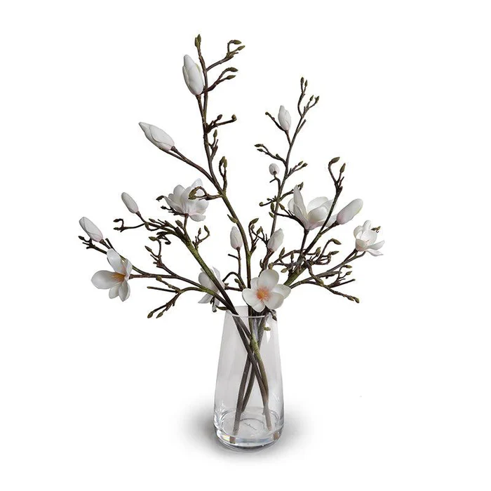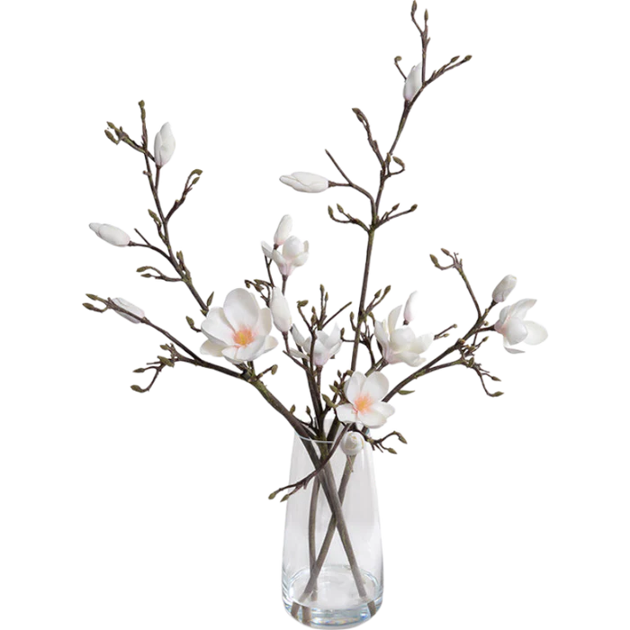Realistic blooming branches of Tulip Magnolia are graced with champagne hued flowers and buds with touches of pink. The Faux Fresh branches look live, sitting in “water” that is actually permanent clear acrylic in a 12″ height clear glass tapered vase. This neutral color blooming piece is a simple statement for interior spaces.